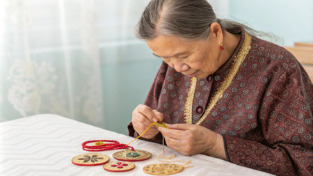 Dressed in a traditional patterned blouse the grandmothers expression is one of concentration as she meticulously stitches a golden thread around the edges of the charm. Beside her.