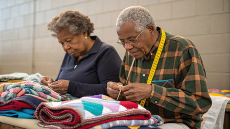 Two seniors a man and a woman are engaged in sewing handmade blankets for a local shelter. The woman with short curly hair concentrates on threading a needle while the man wearing.