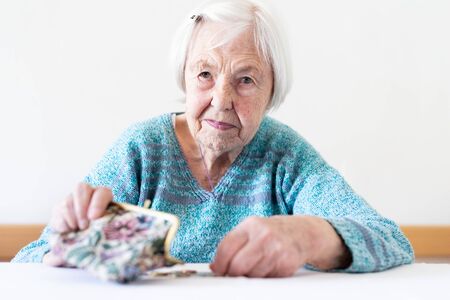 Concerned elderly 96 years old woman sitting at table at home and counting remaining coins from pension in her wallet after paying bills. Unsustainability of social transfers and pension system.