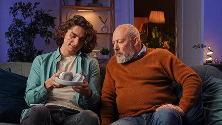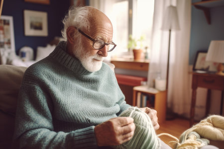 Male Caucasian elderly knitting cozy sweater warmth living room. Generative AI AIG23.