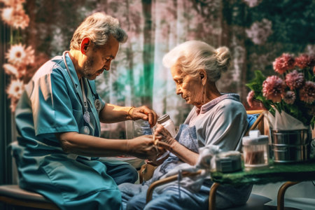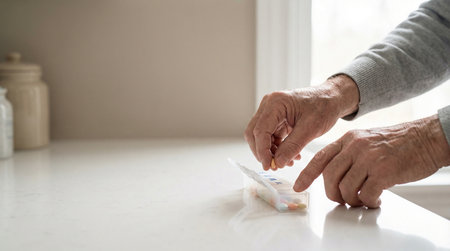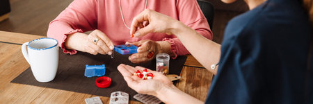 A doctor sorting medications for her elderly positive patient while sitting in the light kitchen