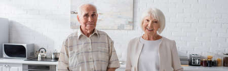 Elderly people looking at camera in nursing home, banner