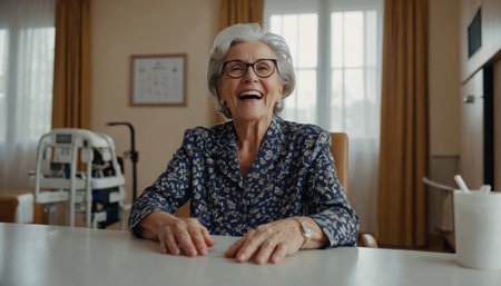 Happy mature woman having fun in geriatric clinic or or nursing home