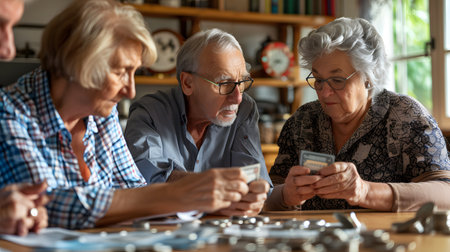 Group of senior friends playing cards and counting money together at home.
