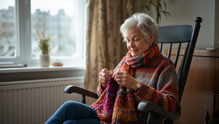 A senior woman is seated in a rocking chair, focusing on her knitting. Bright sunlight fills the room, highlighting her joyful expression and colorful yarn.
