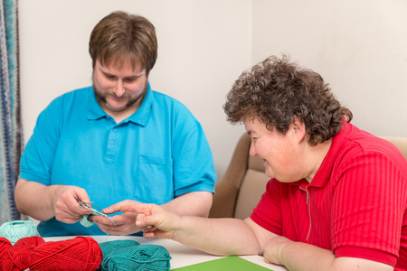 a young man and disabled woman are knitting together