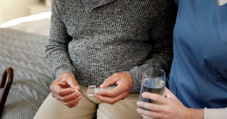 Pills, hands and nurse with senior man in home for medication, supplements or vitamins for wellness. Health, water and caregiver with elderly patient for tablets with treatment in nursing facility.