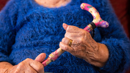 Close up of senior woman hands holding walking stick. Detail of old caucasian grandma hand hold handle of cane. Elderly people concept.