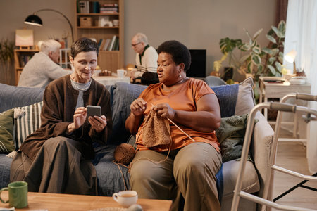 Senior woman showing smartphone to senior Black woman knitting on sofa, background showing senior men interacting at table in nursing home, walker visible in foreground