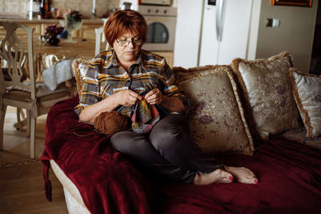 Mature red haired woman in glasses sitting on sofa in living room and knitting using needles and ball of thread. Pensioner home leisure and handmade crafting hobby. Retirement lifestyle