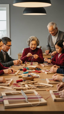 A multi-generational family gathers around a table, engaged in a collaborative weaving project, surrounded by threads, frames, and crafting tools in a cozy indoor setting.