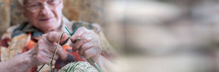 Senior woman knitting at home; panoramic banner