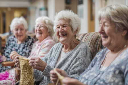 Four smiling seniors gather in a community center, engaged in knitting and sharing stories. The warm atmosphere showcases friendship and creativity during an afternoon activity.