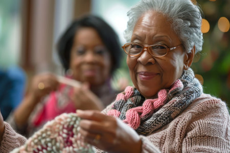 Elderly individuals focus on knitting and crafting activities while learning new techniques in a community center environment.