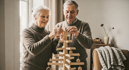 Senior couple arranging ornaments on a handcrafted wooden tree in a softly lit minimalist living room. Warm neutral tones and Scandinavian decor convey a cozy, understated holiday scene.