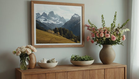 Modern scandinavian living room interior with a wooden commode, a vase of flowers and a photo frame