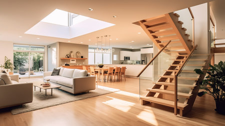 Modern living room with stairs, sofa and coffee table. 3d rendering