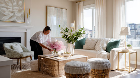 Woman arranging flowers in a bright and welcoming living room with cozy decor