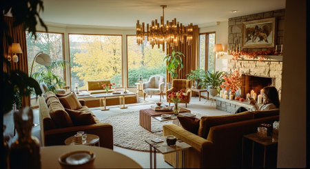A cozy living room with modern furniture, large windows showcasing autumn foliage, warm tones, and stylish decor