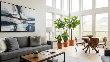 A well-lit interior showcases a contemporary living room with a sectional sofa and a coffee table. An eye-catching floral arrangement sits center, adding vibrant orange blooms. The scene features neutral wall colors, three large windows, and an abstract artwork. Suitable for design, lifestyle, and home decor content.