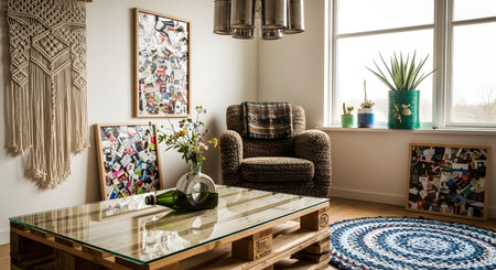 A cozy, boho-style living room corner featuring upcycled and DIY furniture. Key elements include a coffee table made from a wooden pallet, a macrame wall hanging, a comfortable armchair, and framed collages.