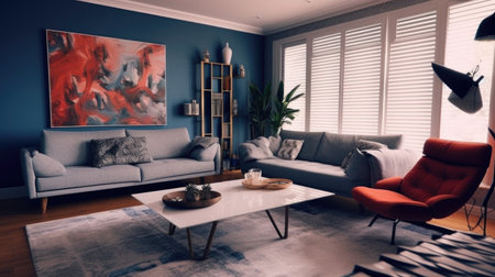 Stylish modern living room interior design with dark blue wall and a carpet on the wooden floor. Generative AI AIG27.
