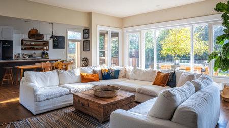 A family-friendly living room with a spacious sectional, playful decor, and plenty of natural light, ideal for casual gatherings and relaxation.