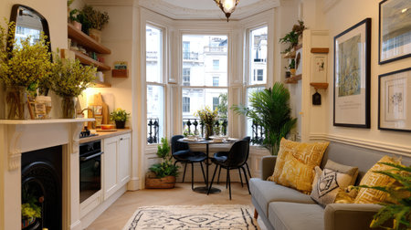 This living room showcases a bright interior with neutral colors and abundant natural light. The scene features a sofa, chairs, table, and various plants. The composition includes framed art and decorative elements, suggesting a comfortable and stylish setting. Suitable for use in lifestyle or interior design content.