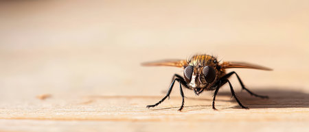 A fly rests on a light wooden surface showcasing its detailed features and texture under natural lighting in a calm environment.