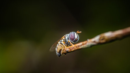 Hover fly on die branch and nature background, Close up photo of insect in Thailand.