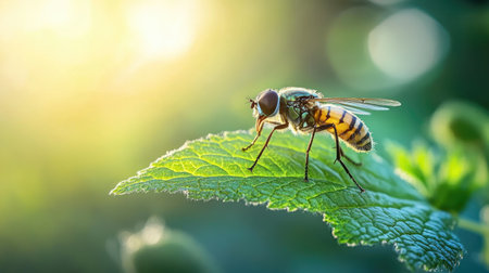 A hoverfly balancing on a leaf, surrounded by the soft green of a plant, as its striped body glistens in the afternoon sun.