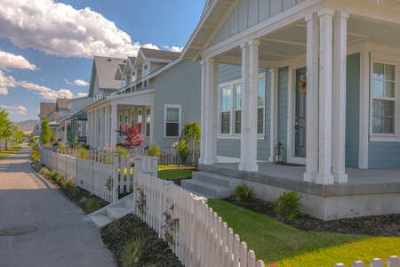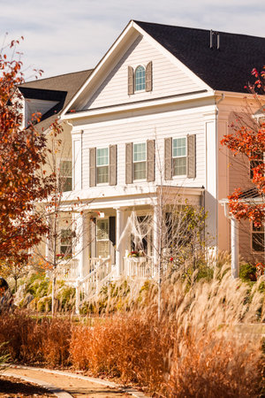 Upscale cottage style homes in suburbs Dallas, Texas with wood siding, covered porch patio with ceiling fans. Colorful autumn leaves and white cladding layer thermal insulation, weather resistance