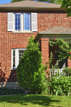 Luxury home exterior on sunny day with blue sky. Detail of entryway