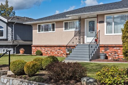 Residential neighborhood house in developed area. Property insurance and real estate. Suburban neighborhood. Private property house. House insurance. Property in neighborhood. Housing market