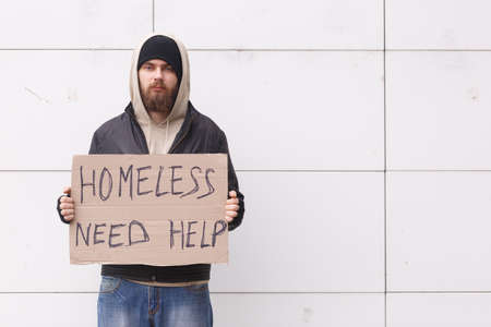A homeless man is standing outside in a cold weather with a cardboard sign asking for help. Outdoor.