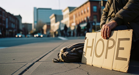 Homeless man sitting on the sidewalk with hope sign in his hand