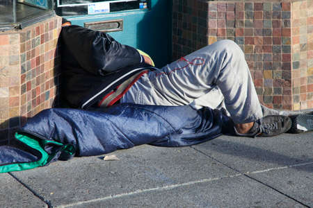 San Francisco, CA, USA - October 23, 2012: Homeless man sleeps on the street Castro in the center of San Francisco