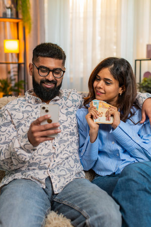 Indian couple man and woman sitting on home sofa holding money cash and smartphone while planning purchases and family budget. Discussing future expenses, savings and income from salary indoors