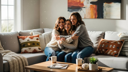 Three women are shown in a close embrace on a comfortable sofa in an interior setting. The scene is brightly lit, with natural light suggesting a daytime environment. Decorative pillows and a wooden coffee table add to the welcoming ambiance. The image is suitable for various commercial uses, including lifestyle and editorial content.