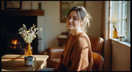 A woman stands by a window, holding a cup of coffee, surrounded by plants and furniture in a warm and inviting room with natural light.