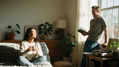A happy couple sits on a sofa in a minimalist living room, holding white mugs and looking affectionately at each other. The scene captures a relaxed morning moment of connection and romance at home.