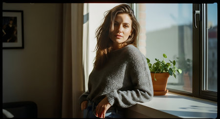 A woman standing in a sunlit room with large windows, wearing a cozy sweater and jeans, looking thoughtfully out at the city skyline