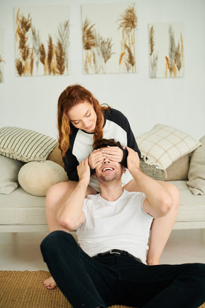 Couple enjoying a joyful moment together while laughing in a cozy room filled with vintage decor