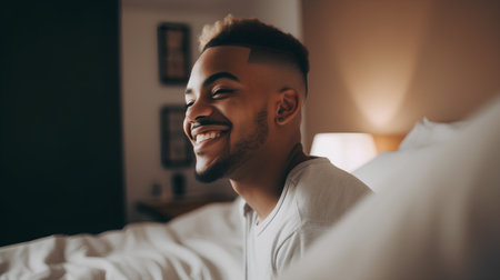 Happy african american man smiling while sitting on bed at home