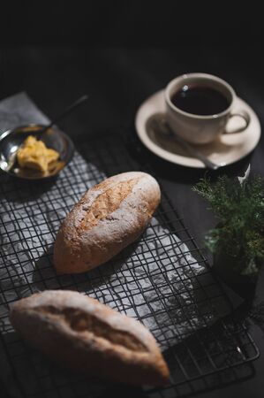 Baguette, European style bread with margarine and black coffee on black wood table in early morning time with hard light effect.
