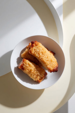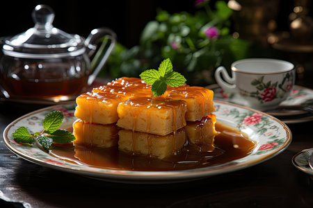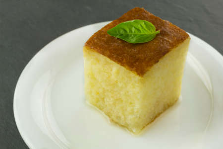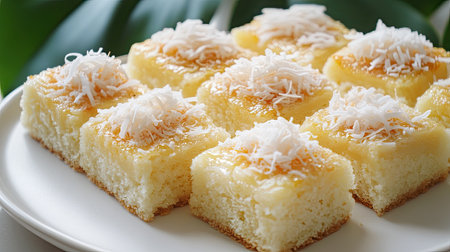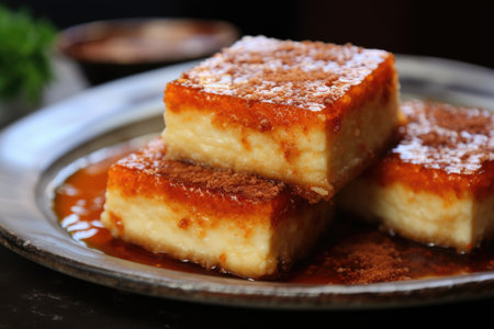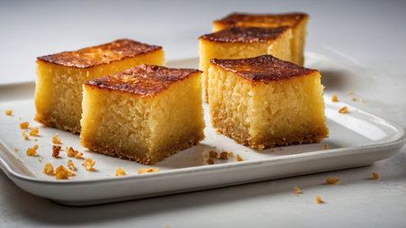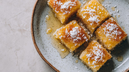 top view, plate of freshly baked basbousa squares with coconut flakes and syrup glistening. Generative