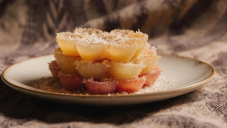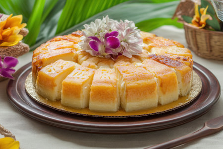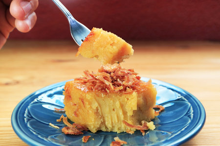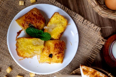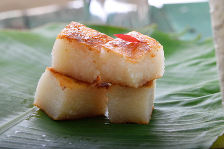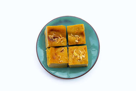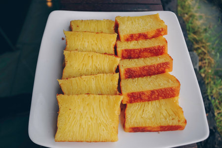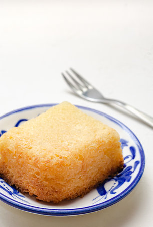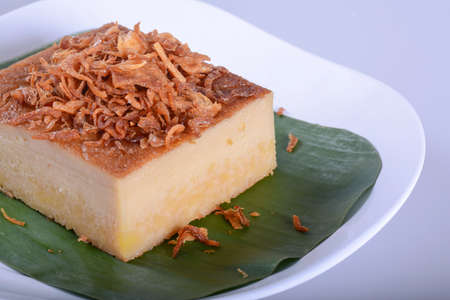Malaysia popular and traditional dessert and snack on a Plate. Kuih Bingka Ubi or Baked Tapioca Cake