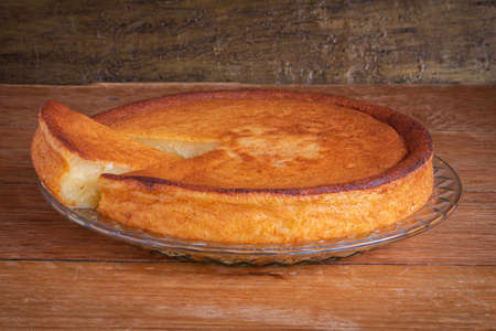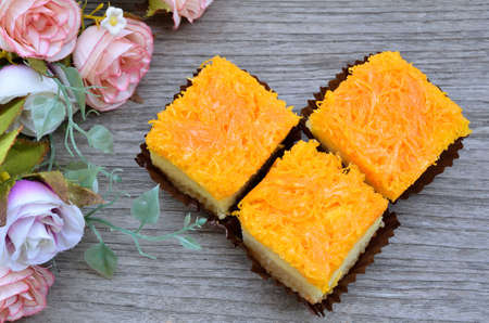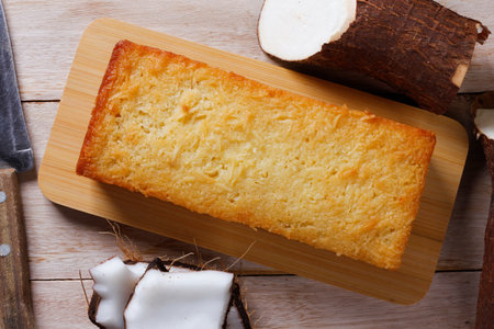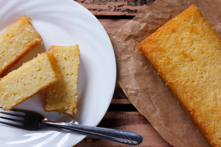 Traditional homemade cassava cake whit coconut on a rustic wooden table. Top view