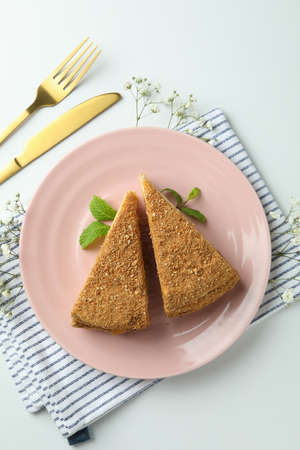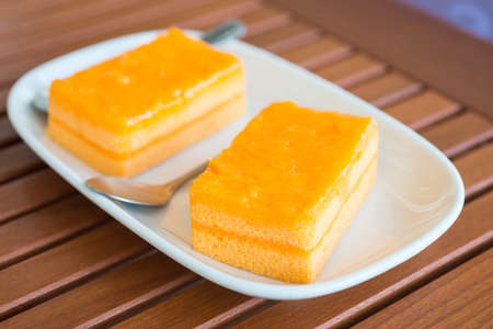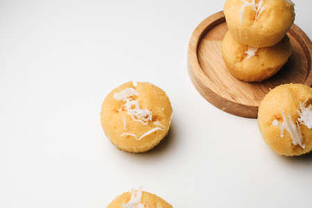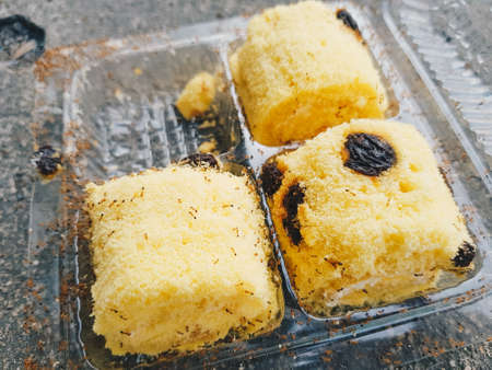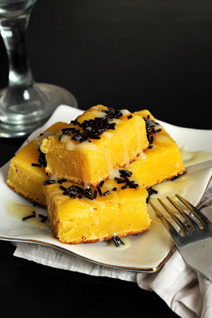 Bika Ambon, Indonesian cake with square slices in white plate. Yellow cake from Medan, Indonesia.