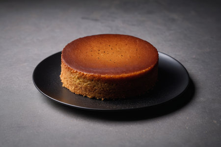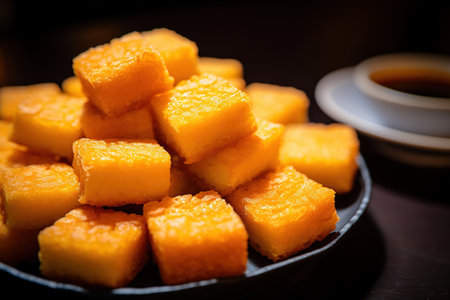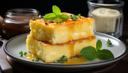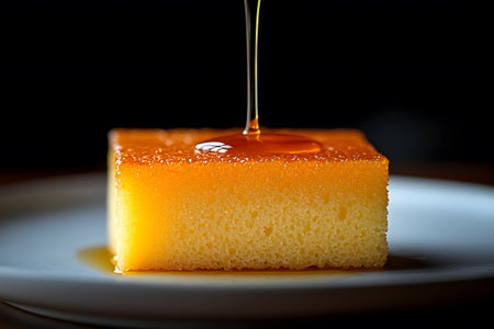 A close-up view of a moist yellow cake slice, skillfully drizzled with honey, placed on a white plate. the warm golden hue of the cake contrasts beautifully with the dark background, texture and sweetness. Generative AI